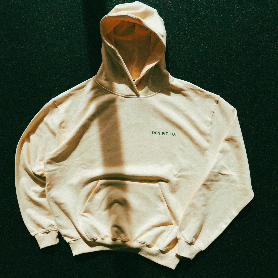 The Almond Oil Terry Cotton Hoodie is one of the most premium pieces in the Den lineup. Cut from heavyweight organic terry cotton, it delivers a structured oversized fit that stays comfortable without feeling sloppy. The front keeps things minimal, while the back features a raised DENFIT silicon puff print that stands out with a clean, modern look. This is the hoodie you live in — warm, durable, and designed for people who train hard and expect quality in everything they wear.